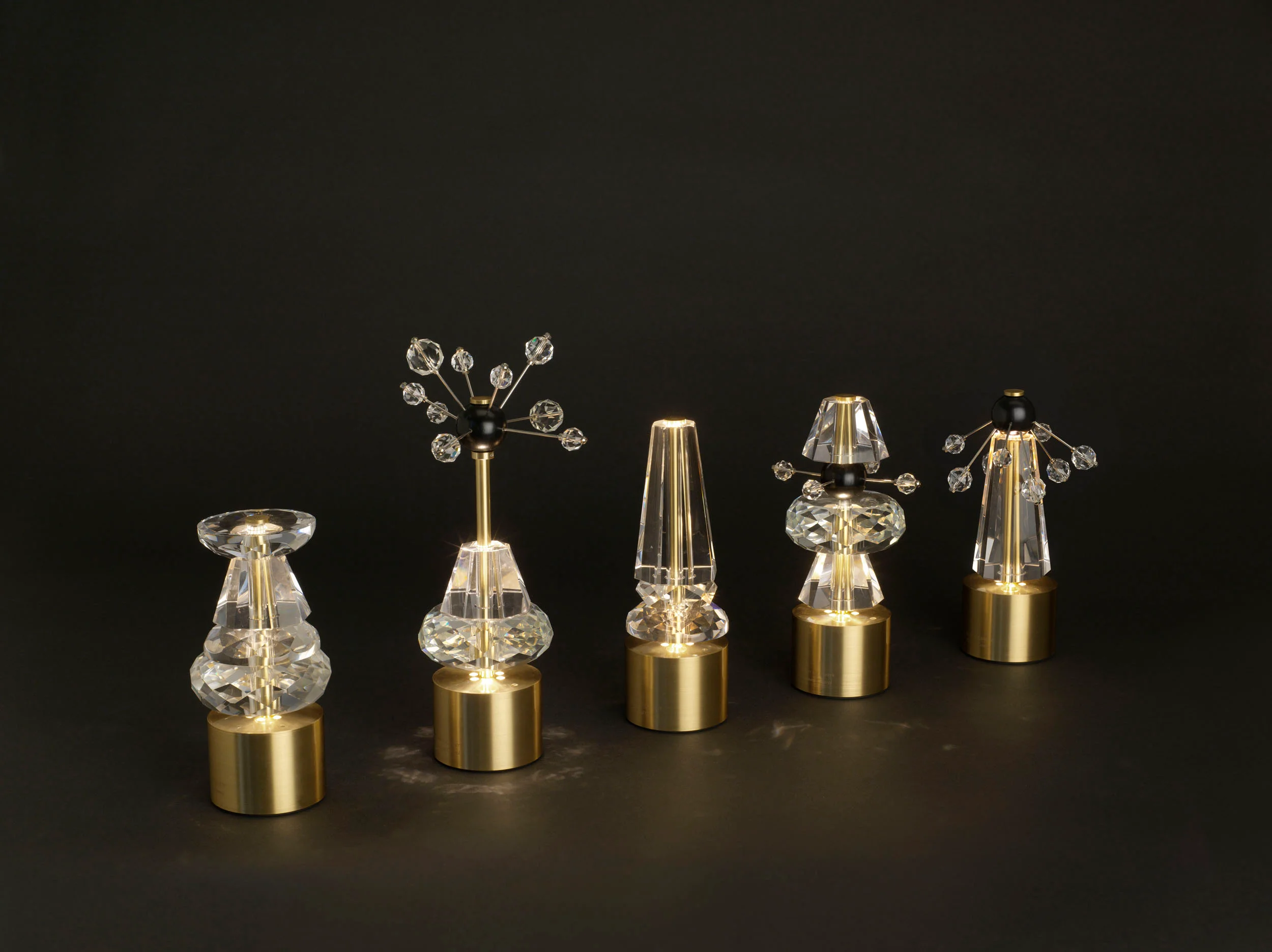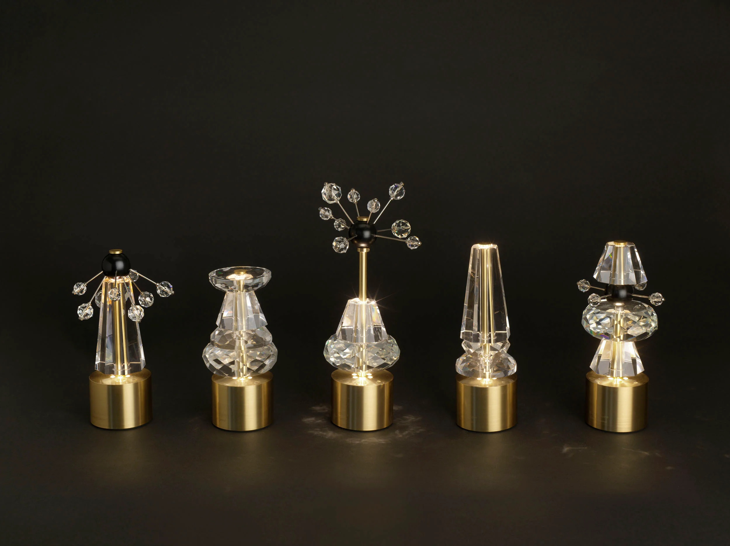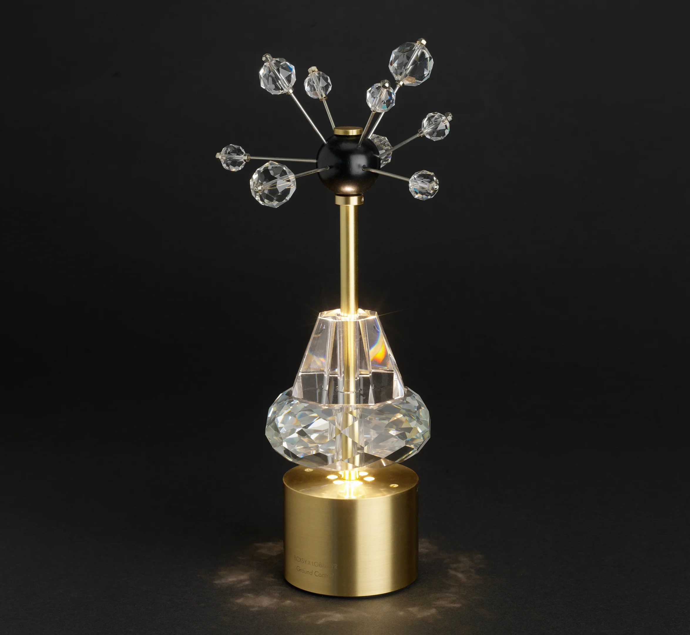 Die Leuchten selbst wirken wie kleine planetare Skulpturen. Ihre Kristalle werden von Hand geschliffen und bringen das Licht so zum Tanzen, dass eine stille, intime Atmosphäre entsteht. Durch die besondere Ausrichtung des Leuchtpunkts bleibt das Licht angenehm blendfrei und konzentriert sich auf den Tisch oder Boden. Dadurch entsteht ein sanfter Lichtkegel, der Möbelstücke, Drinks oder dekorative Elemente beinahe inszeniert.