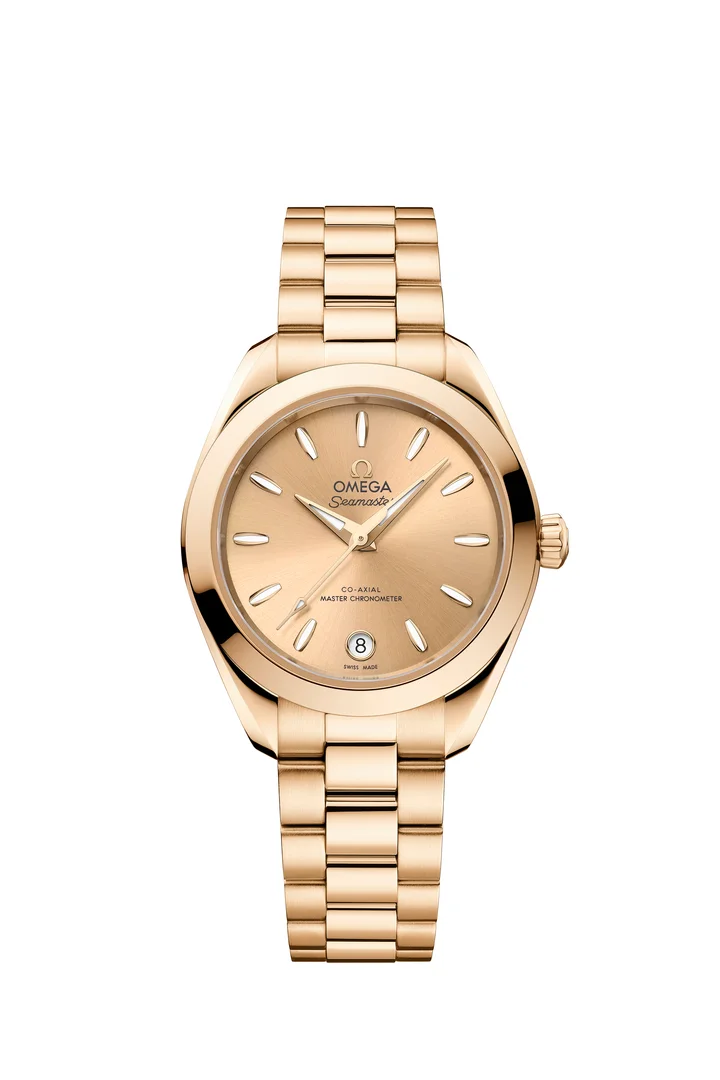 „Ich sehe die Uhr nicht einfach nur als Accessoire“, so Sunday Rose, „sie ist ein Schmuckstück, das mein Outfit komplettiert, ohne zu dominieren.“ Gerade die Details wie das filigrane Zifferblatt und die schlanke Form faszinierten sie sofort. Für sie ist die Uhr leicht und angenehm zu tragen; perfekt für junge Frauen, die Wert auf Ästhetik und Komfort legen. Die „Aqua Terra“, seit 2002 Teil der „Seamaster“-Familie, ist für ihre Vielseitigkeit bekannt: Der Name steht für Wasser und Land, für Robustheit und Stil. Die neue 30-mm-Version greift diese Idee auf und interpretiert sie im Trend kleinerer, technisch anspruchsvoller Uhren. Herzstück sind die neu entwickelten Kaliber 8750 (Edelstahl und Bicolor) und 8751 (Gold), die kleinsten und flachsten Co-Axial-Master-Chronometer, die Omega je gebaut hat. Antimagnetisch bis 15.000 Gauß mit einer Spiralfeder aus Silizium und über 48 Stunden Gangreserve verbinden sie Miniaturisierung mit maximaler Leistung. Optisch reicht die Kollektion von kühlem Edelstahl bis zu den exklusiven Omega-Legierungen Sedna-Gold und Moonshine-Gold, kombiniert mit Zifferblättern aus Perlmutt, tiefem Blau, zartem Lila oder kräftigem Grün.