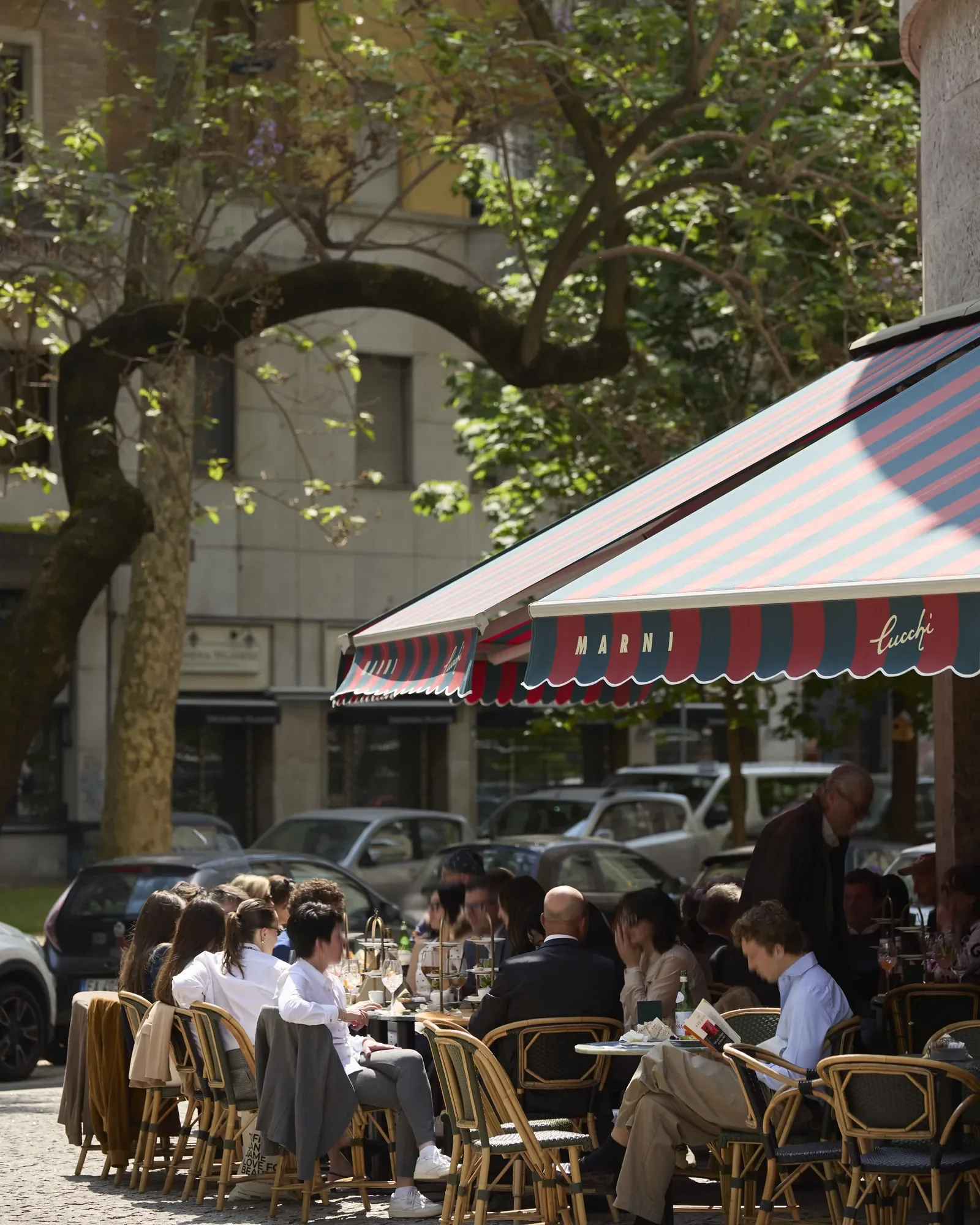 Das ikonische Caffè Cucchi in Mailand wird durch Marni zur Design Week neu inszeniert. Rot-blaue Streifen, stilvolle Details und italienische Café-Kultur machen den Ort zu einem der gefragtesten Treffpunkte des Fuorisalone. Foto: Alberto Strada