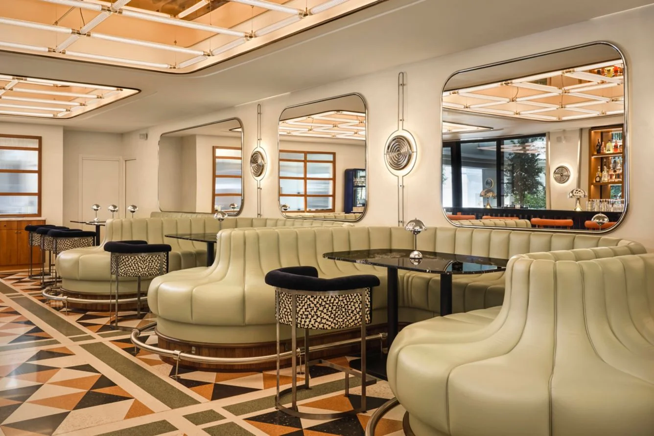 Innen zeigt sich das Designstudio AvroKO in Bestform. Die 60er- und 70er-Jahre treffen auf zeitgenössische Materialien: Samt, Marmor, geometrische Muster. Inspiration holte sich das Team aus der italienischen Modeszene, wodurch die Räume zwischen Retro und Gegenwart oszillieren. Ein Wandgemälde des Adam Ellis Studio bildet einen ersten Höhepunkt – ein Babylonischer Garten mit Medici-Tieren, surreal und zugleich kunstvoll modern interpretiert.