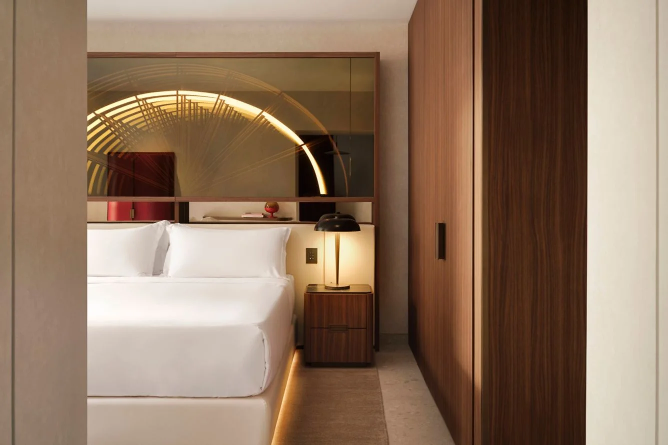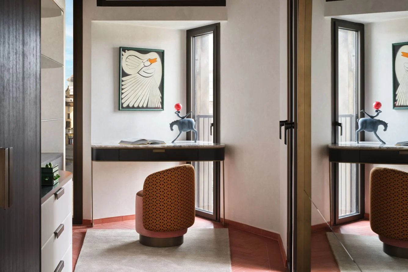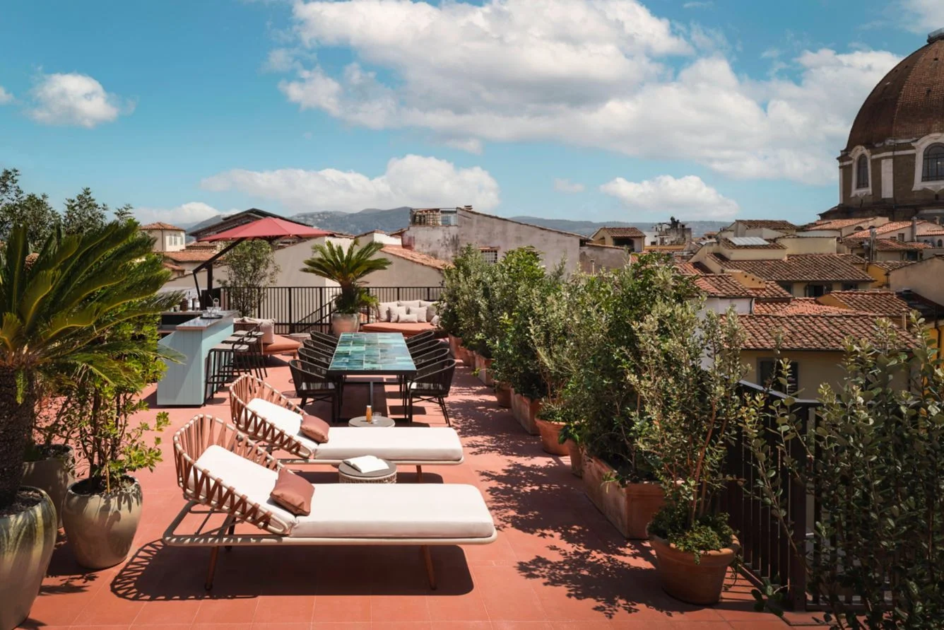Die 119 Zimmer und Suiten spiegeln die Farben Florenz’ wider – Medici-Rot, königliches Blau, sattes Grün – und lassen mit Lichtinstallationen über den Betten die Bögen der Stadt aufleben. Das Penthouse bietet mit 140 Quadratmetern Terrasse einen Blick über die gesamte Skyline.