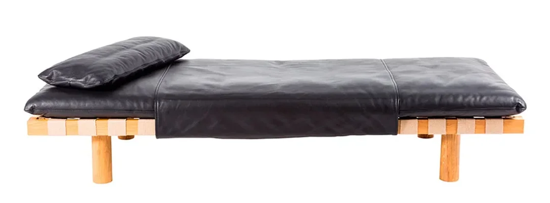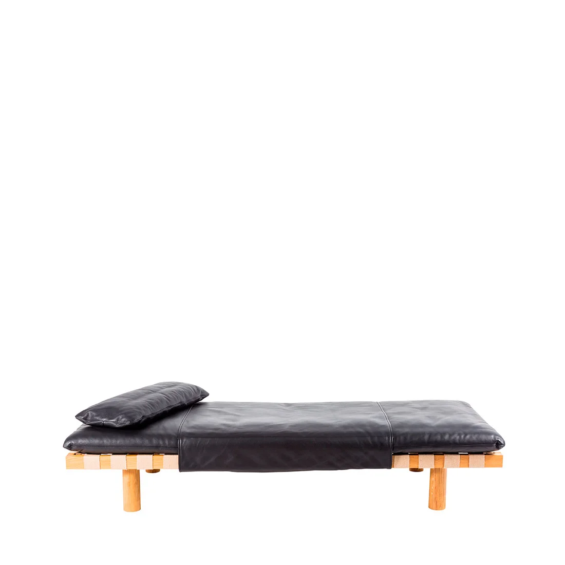 Die textile Oberfläche erzeugt eine warme, matte Erscheinung, die sich mühelos in unterschiedliche Interieurs einfügt. Ein Daybed, das nicht auffallen muss, um Wirkung zu zeigen, und das sich ebenso als Entspannungsinsel wie als modernes Wohnobjekt versteht.