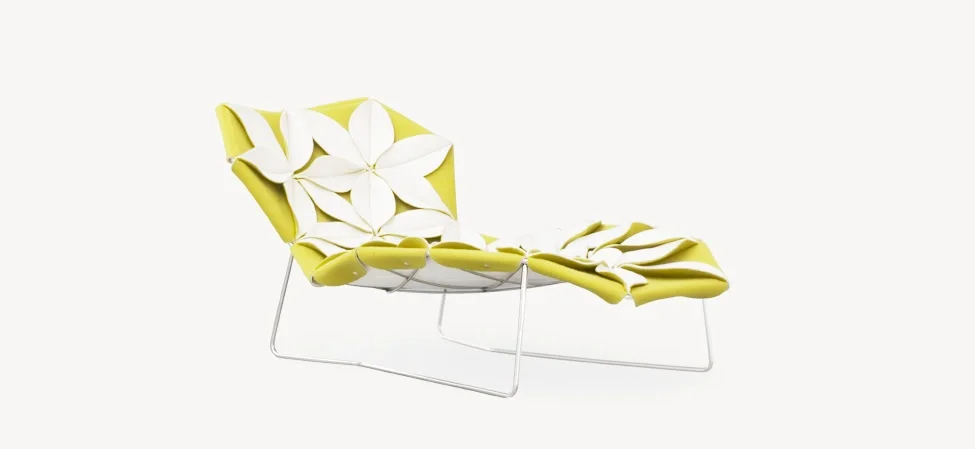 Das Antibodi von Moroso verwandelt textile Handwerkskunst in florale Geometrie. Das von Patricia Urquiola entworfene Stück wirkt wie eine textile Skulptur, deren Oberfläche aus hunderten blattförmigen Elementen besteht – mal offen, mal gefüllt, immer lebendig. Die Kombination aus Struktur, Relief und Bewegung erzeugt ein Möbel, das eher wie ein Kunstobjekt erscheint als ein klassischer Lounger.