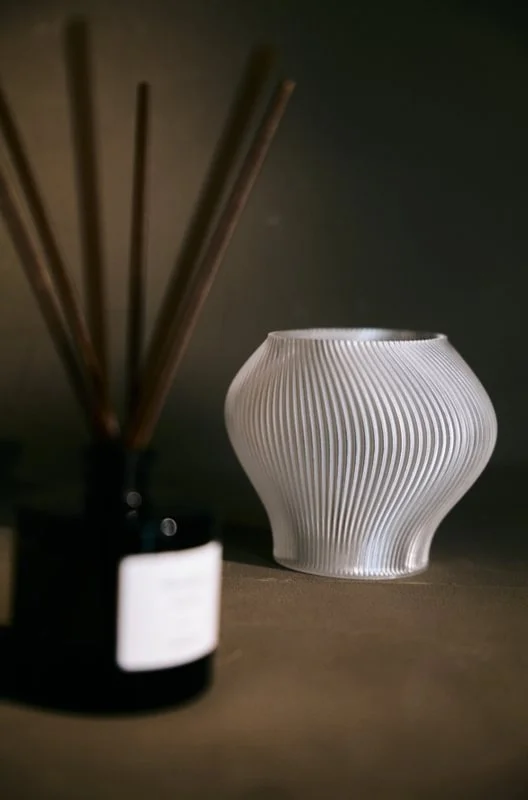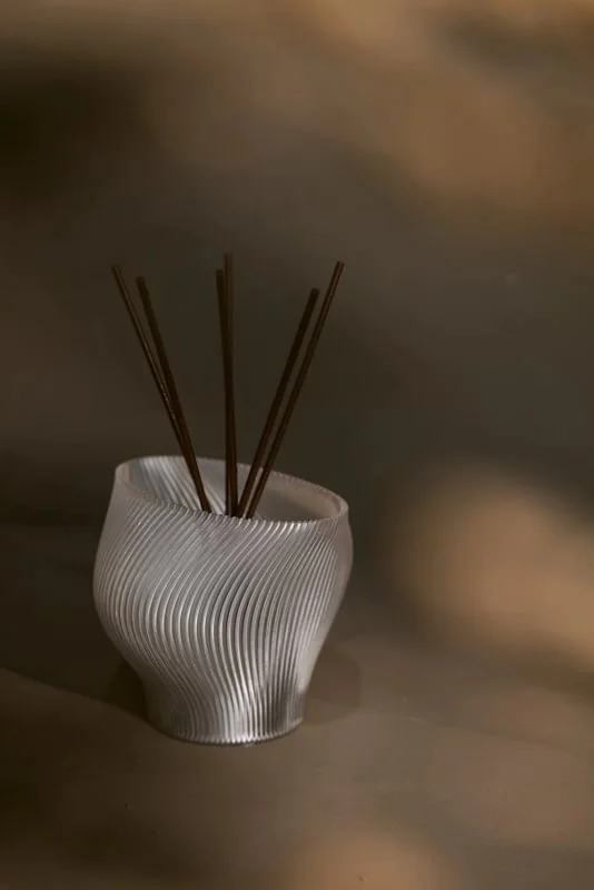 Herzstück der Kooperation sind die Gefäße Koyl und Vellen – elegante Behältnisse, die entweder große Duftkerzen oder Duftstäbchen aufnehmen. Jedes Vessel erzählt eine eigene Geschichte: klar, reduziert und zugleich warm in der Wirkung. Die Gefäße sind Designobjekte und stille Begleiter für Momente des Innehaltens.