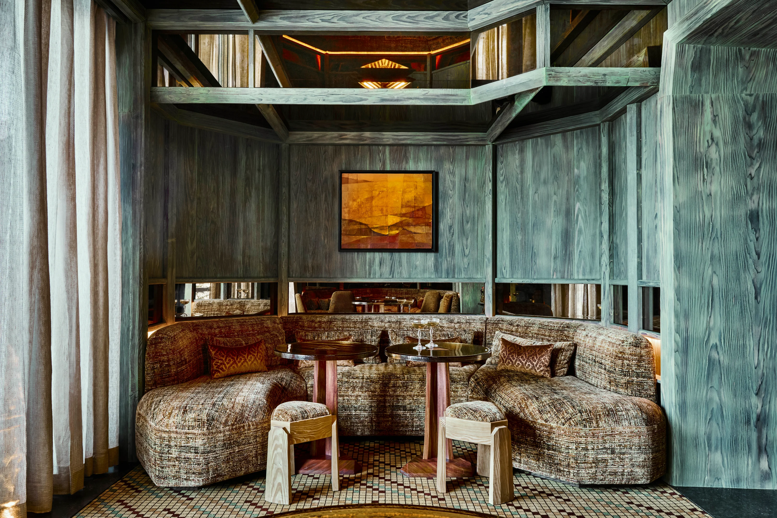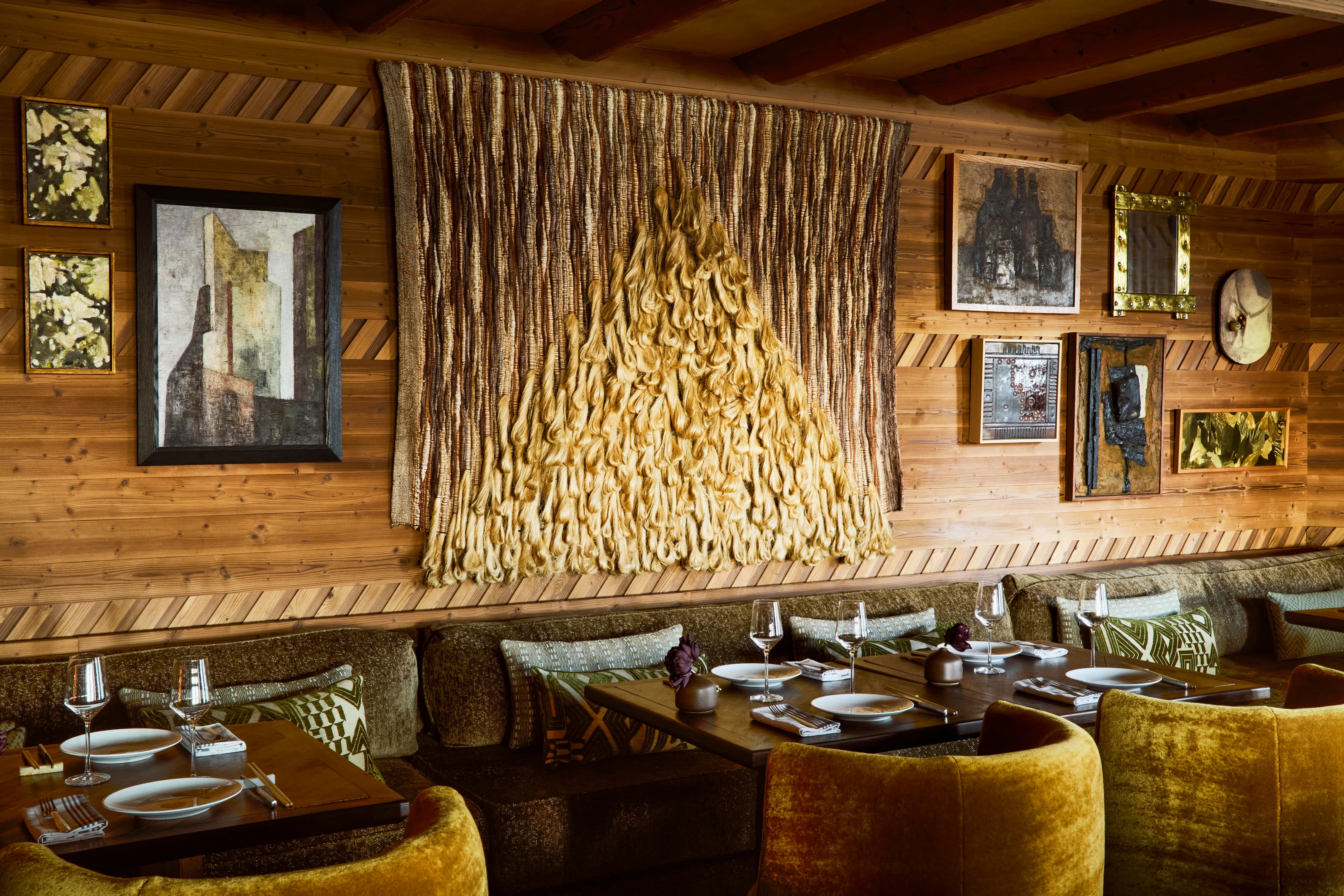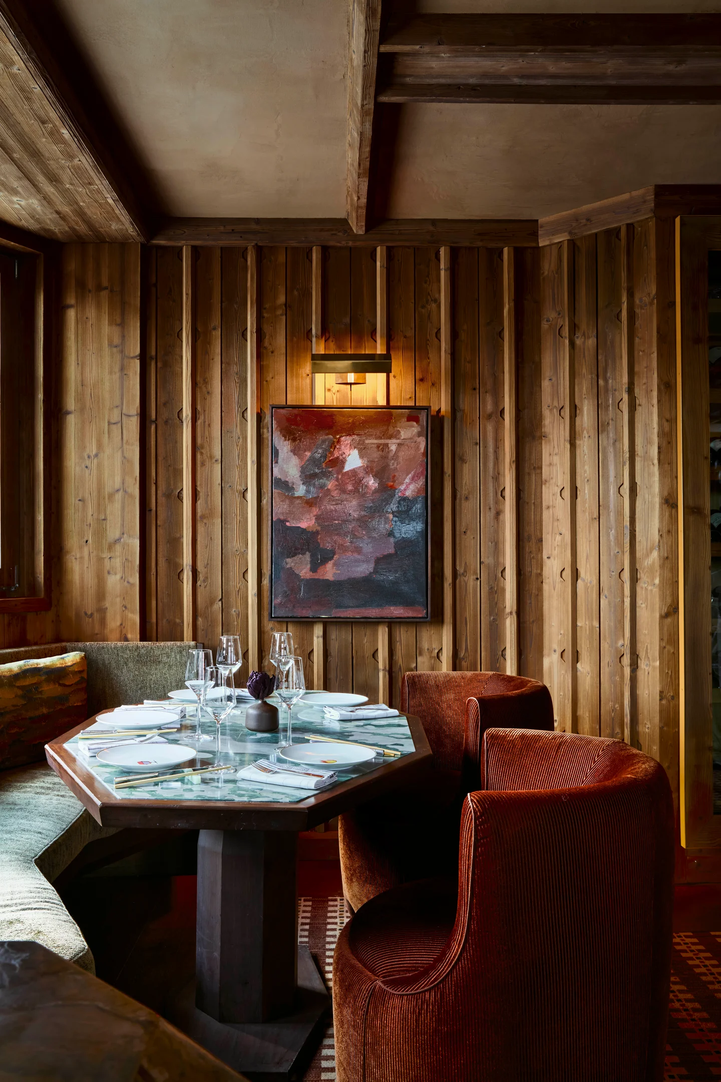 Wearstlers Konzept verbindet die klaren Formen des Brutalismus mit Materialien und Strukturen, die für die Region charakteristisch sind. Stein aus der Umgebung, verarbeitetes Holz und natürliche Textilien prägen die Räume, ergänzt durch eine gedeckte Farbpalette aus Tiefgrün, Ocker und Kaminrot. Die Gestaltung verzichtet auf dekorative Effekte. Sie folgt vielmehr einer funktionalen Logik, die den Innenräumen Struktur und Gewicht gibt, ohne die Umgebung zu verdrängen.