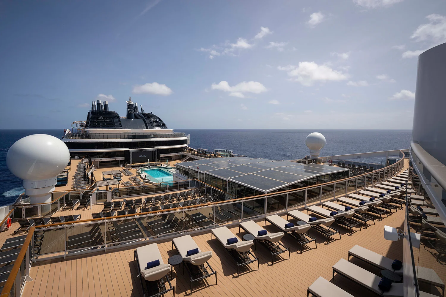 Tagsüber haben Sie die Wahl: Entspannen Sie auf dem privaten Sonnendeck mit Pool, Cabanas und traumhafter Aussicht oder lassen Sie sich im MSC Aurea Spa rundum verwöhnen.