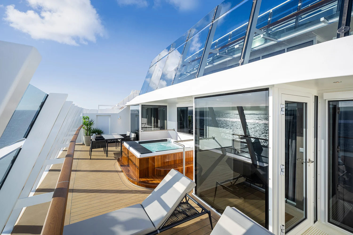 Hier genießen Sie die Ruhe eines privaten Clubs und gleichzeitig die Vielfalt und Unterhaltung eines modernen Kreuzfahrtschiffes. Schon bei der Anreise sorgt ein separater Check-in für einen nahtlosen, stressfreien Start. In den eleganten Suiten erwarten Sie edles Design und atemberaubender Meerblick.