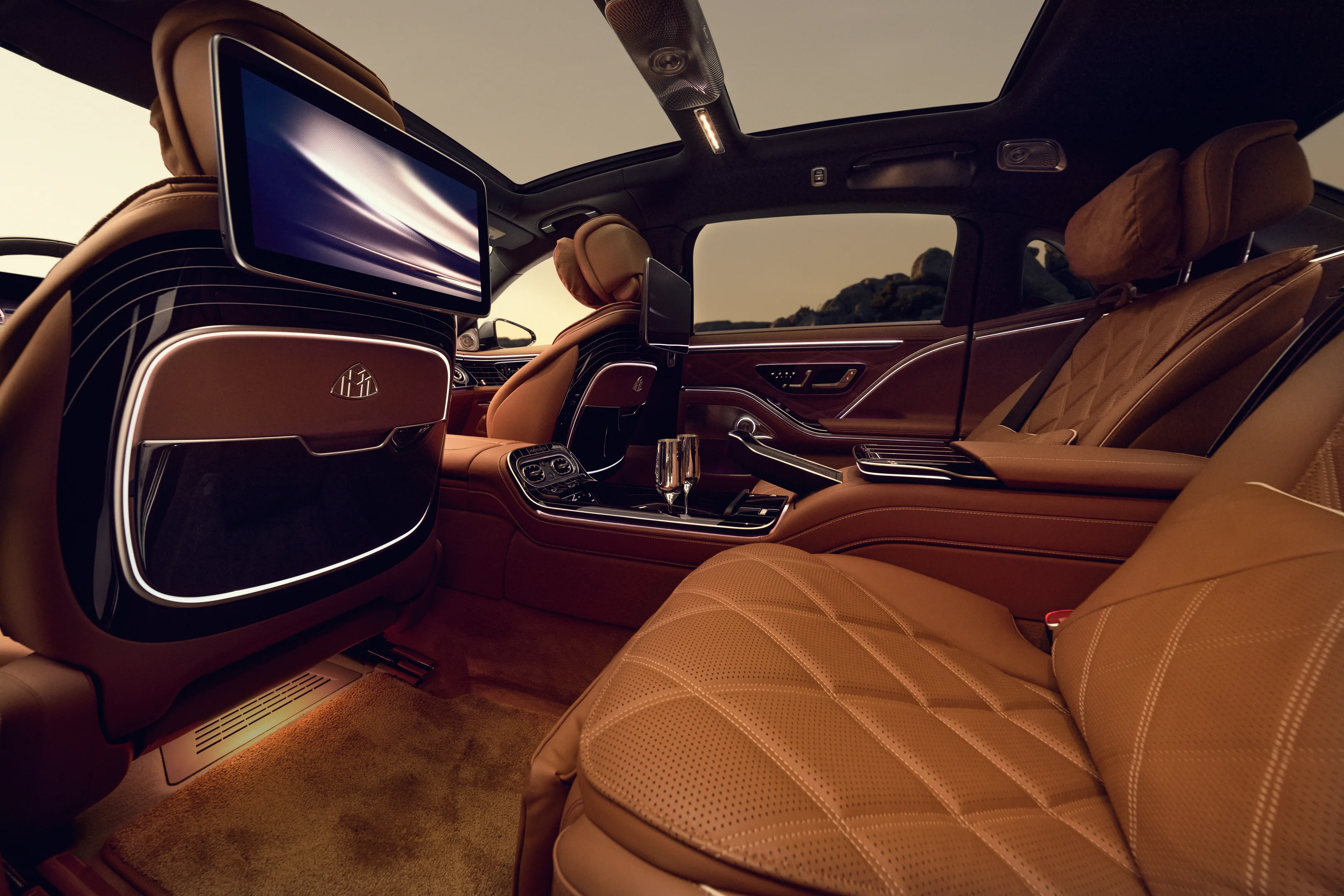 Besondere Bedeutung kommt den hinteren Plätzen zu, die in diesem Auto – oftmals im Chauffeurbetrieb – vielleicht die besten sind. Den Fondpassagieren sind zwei 33,3 Zentimeter große Bildschirme mit neuen, individuell konfigurierbaren Fernbedienungen gewidmet. Damit lassen sich Fahrzeugfunktionen wie Klimatisierung und Fensterrollos sowie das Rear-Seat-Entertainment besonders bequem und intuitiv steuern. Integrierte Kameras ermöglichen zudem Videotelefonie, was jeder Fahrt eine neue Dimension von Komfort und Produktivität verleiht.
