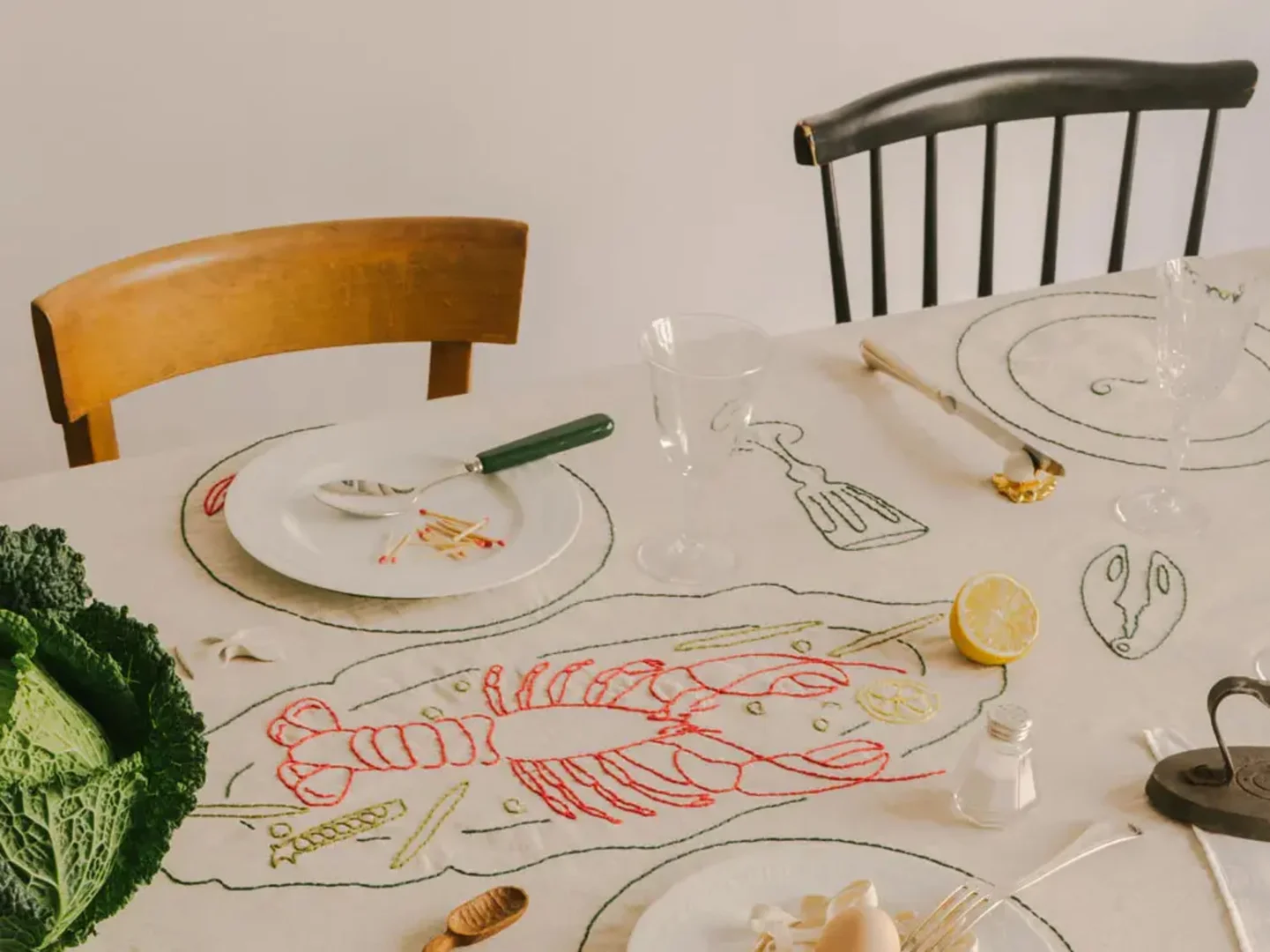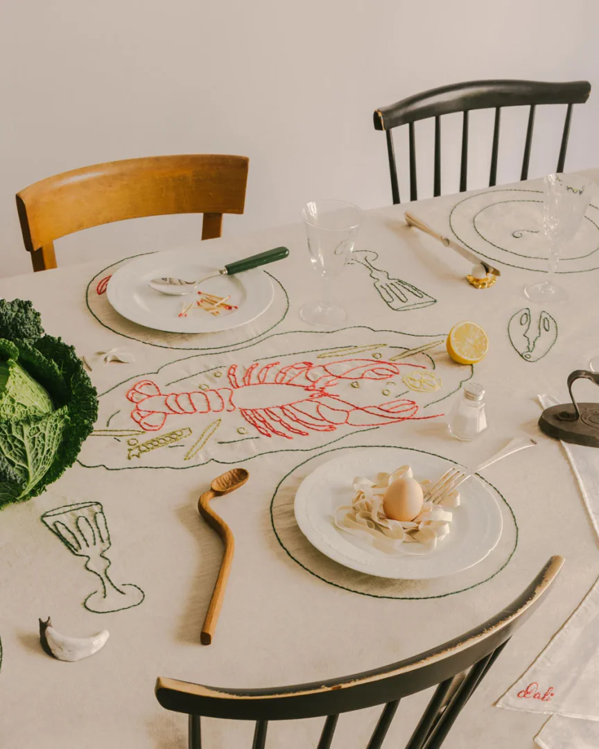 Ein Beispiel dafür liefert die französische Marke Œuvres Sensibles, deren „Dali’s Dinner Tablecloth“ das Surreale auf den Tisch bringt. Der Stoff zeigt Motive, die an Salvador Dalís Traumwelten erinnern – fließende Formen, verspielte Farbverläufe, ein Hauch von Unvernunft. Statt Neutralität gibt es hier Visualität. Der Tisch wird zur Leinwand, die zwischen Kunst und Kitsch balanciert, aber niemals beliebig wirkt.