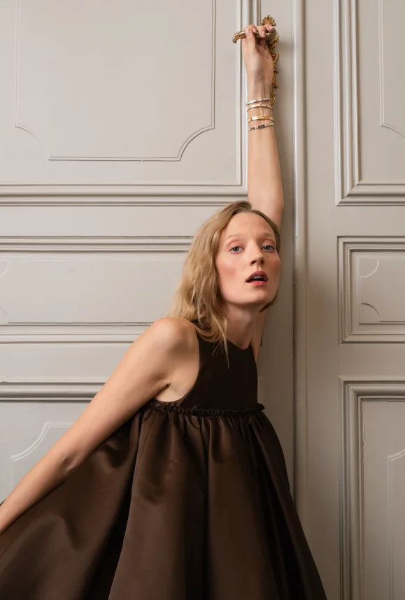 „Love“-Armreif von Cartier in Weißgold mit Diamanten, „Love“-Armreif von Cartier in Roségold mit Diamanten, „Love“-Armreif von Cartier in Roségold, „Love“-Armreif von Cartier in Weißgold, CARTIER.COM; Kleid von Malva Florea, MALVAFLOREA.COM