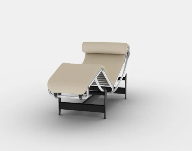 1927 skizzierte Le Corbusier Figuren in verschiedenen Sitzpositionen, darunter eine Person mit hochgelagerten Füßen – eine Haltung, als würde sie sich gegen einen Baum stemmen. Aus dieser flüchtigen Zeichnung entwickelte Perriand ein durchdachtes Konzept: eine Liege auf einer Stahlwiege, variabel in der Position wie ein Schaukelstuhl. Die geschwungene Sitzfläche passt sich der Körperform an, die gerollte Kopfstütze und der elegante Rahmen formten ein Profil, das heute zu den bekanntesten der Möbelgeschichte zählt.