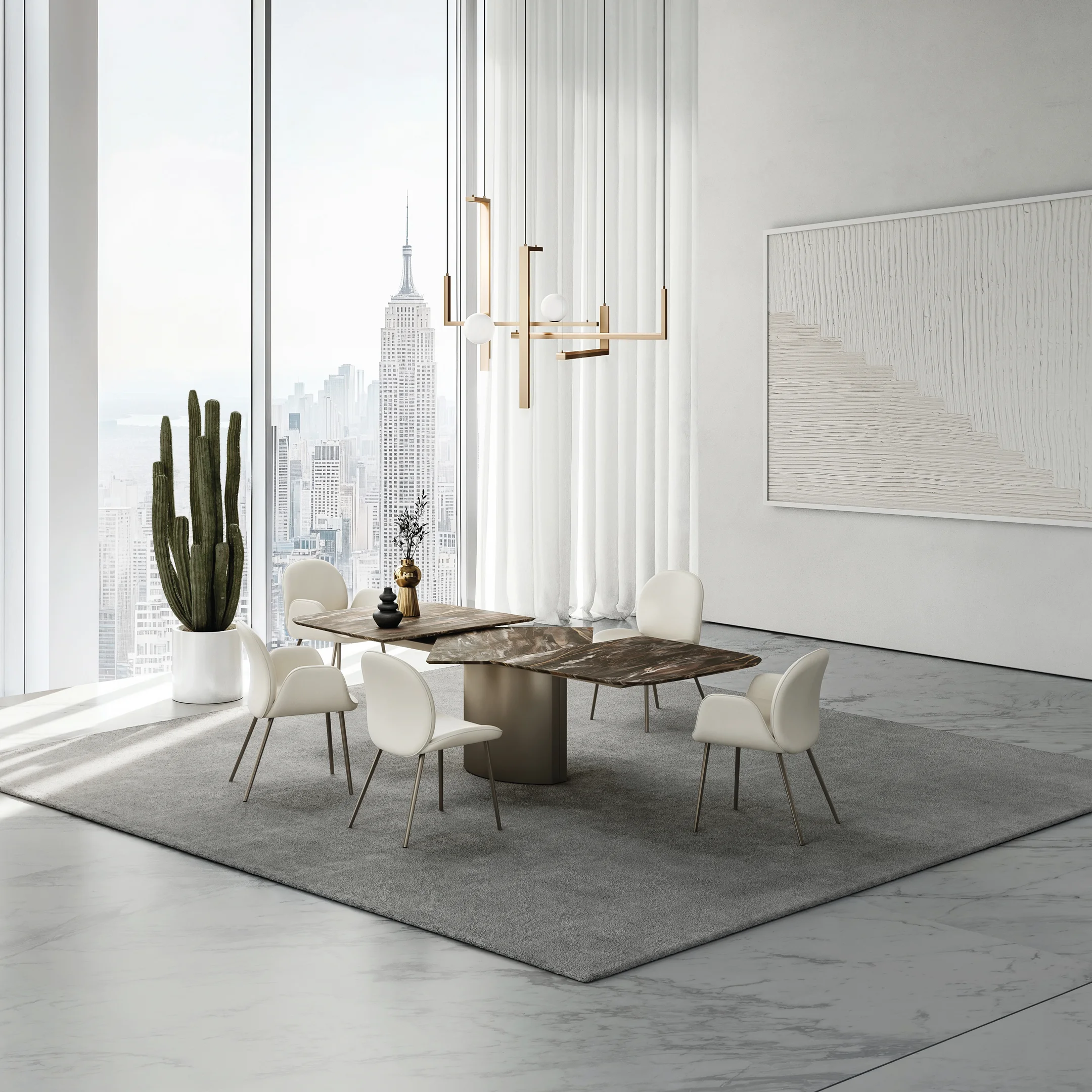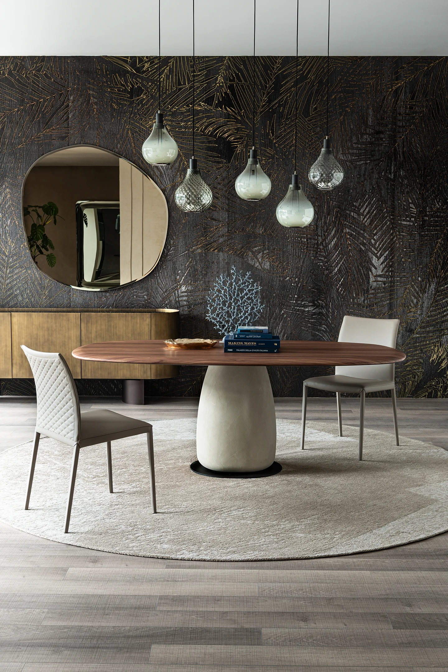 Der Tisch Bonnet von Marialaura Irvine fasziniert mit einer Mischung aus Mörtel, Inertmaterialien und zerkleinertem Perlmutt, die von Hand mit der Spachtel auf der gesamten Oberfläche des Tisches aufgebracht wird. Der Stuhl Archie von Yabu Pushelberg verführt mit Stahlrohr, zertifiziertem Holz und abnehmbarem Stoff- oder Lederbezug.