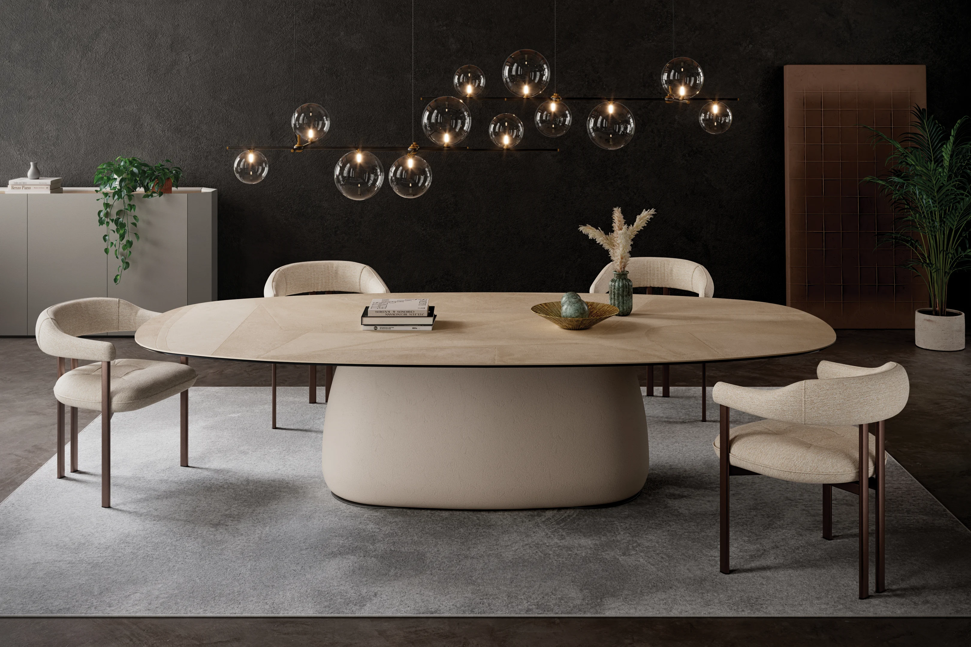 Vor 30 Jahren entwickelte Peter Draenert einen größenverstellbaren Esstisch mit leichtgängiger Hubmechanik für eine integrierte Mittelplatte aus Naturstein oder Holz und vielen Gesichtern: bootsförmig, rechteckig, organisch oder oval. Das Modell – hier in Venice Black und mit Stuhl Cobe – wird mit vier verschiedenen Sockeltypen angeboten.