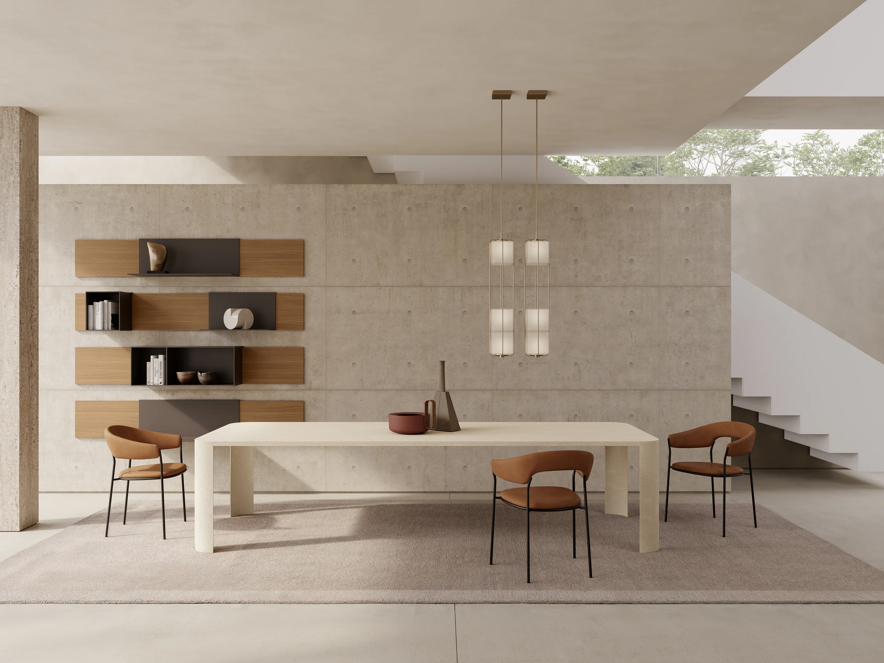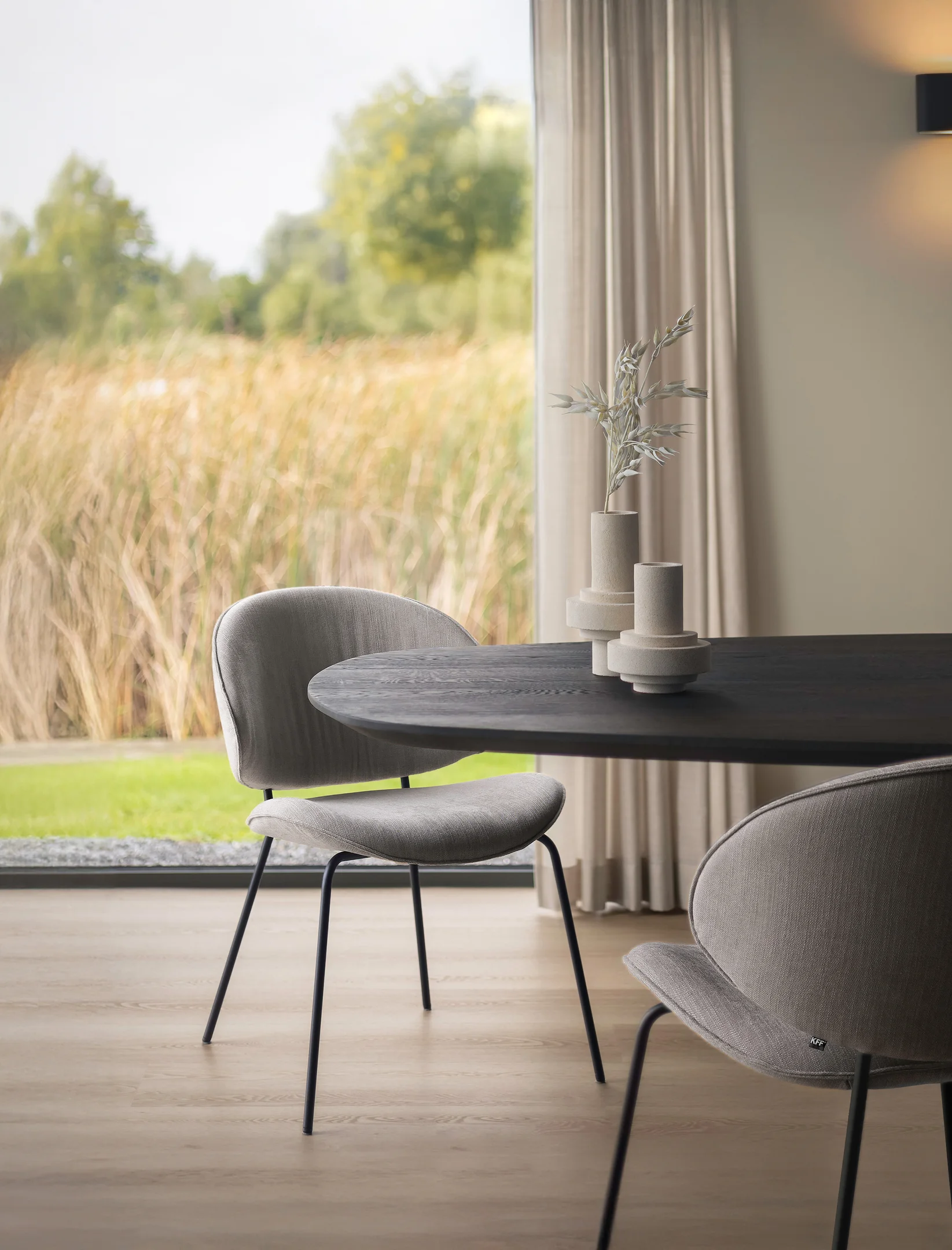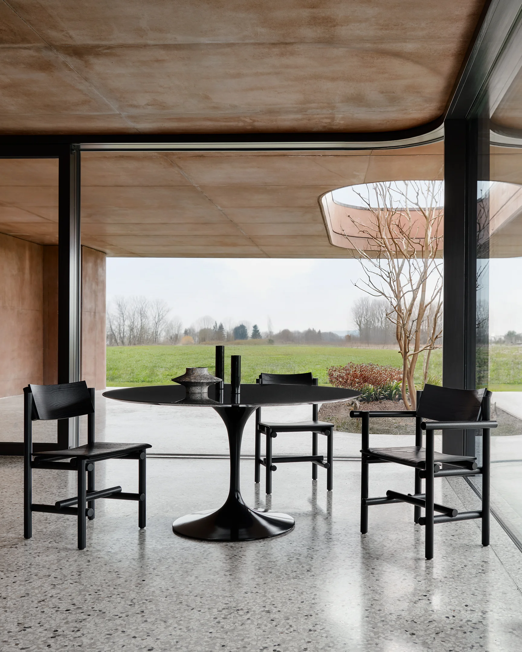 Eine Schale mit weichen Linien als Untergestell: So lädt der Tisch – hier mit Stuhl Norma Couture – ein, Platz zu nehmen. Es gibt ihn in den Versionen als Modell Argile, vollständig mit Ton verkleidet, als Keramik und Keramik Round, als Holztisch Wood und Wood Round und als Modell Ker-Wood aus Holz mit drehbarem Keramikeinsatz.