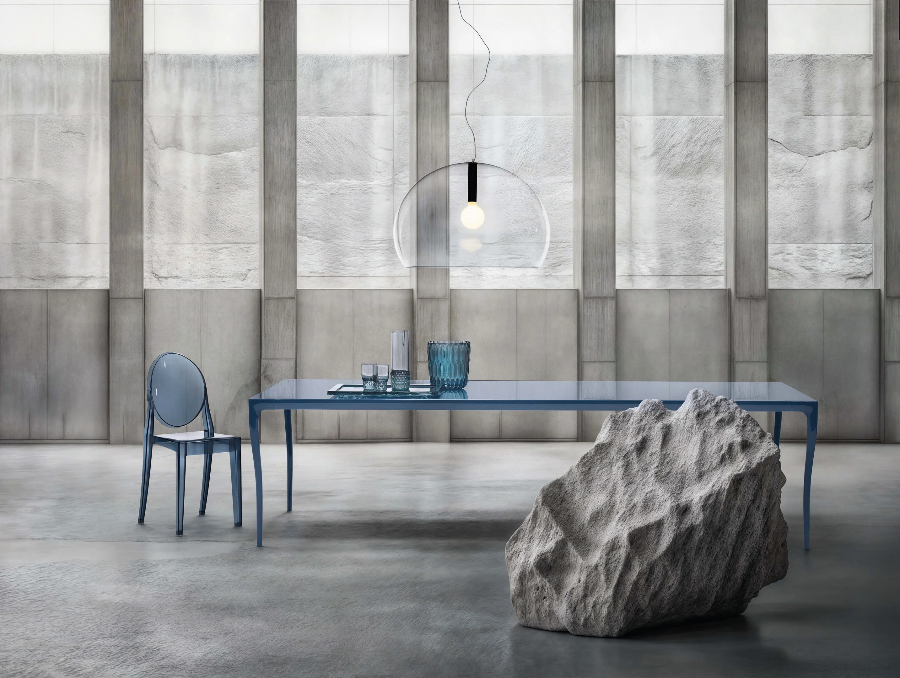 Ludovica Serafini und Roberto Palomba ließen sich für den Tisch Albert vom berühmten französischen Handwerker André Charles Boulle aus dem 18. Jahrhundert inspirieren, dessen geschwungene Tischbeine en vogue waren. Als passender Begleiter veredelt der Stuhlklassiker Victoria Ghost von Philipp Starck das Setting.