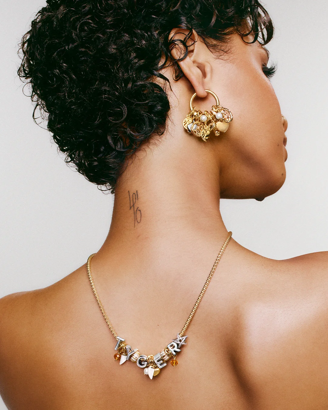 Die Kampagne rückt Tylas ganz persönliche Schmuckauswahl in den Fokus – kleine, aber bedeutungsvolle Stücke, die wichtige Kapitel ihrer Karriere und Identität widerspiegeln. Der Cherry Blossom Charm etwa steht für ihr ikonisches Musikvideo zu „Water“, während der Mini Shark Tooth Charm ihre Wurzeln und wilde Entschlossenheit symbolisiert.