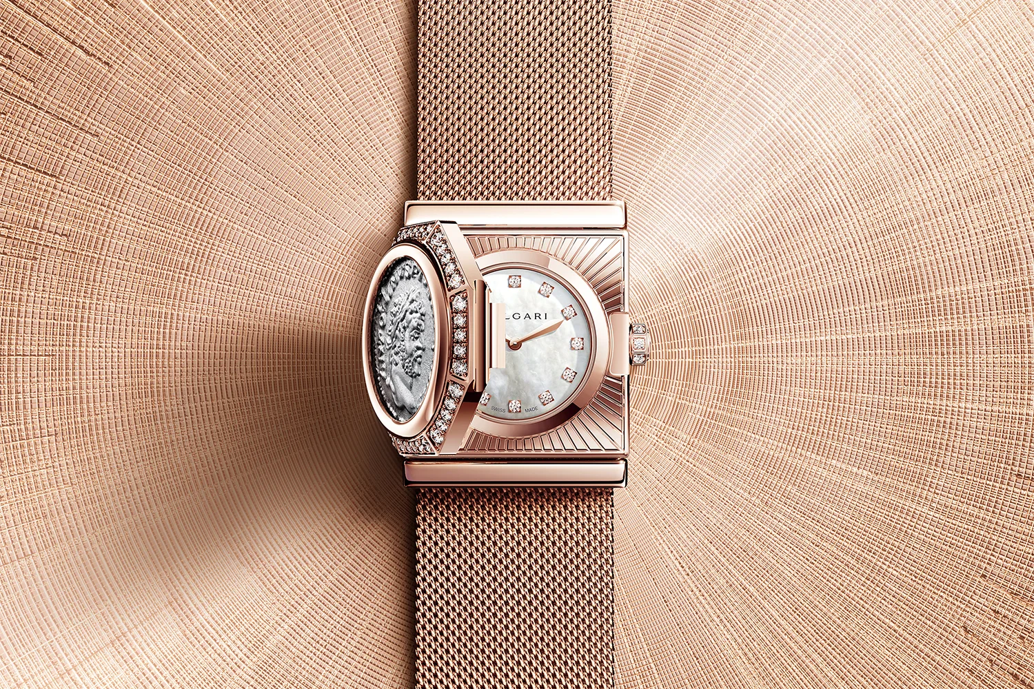 Erstmals rückt Bulgari dabei die traditionelle Kunst des Mailänder Armbandgeflechts in den Fokus. Das sogenannte Maglia Milanese, einst von Goldschmieden der Renaissance entwickeltes feines Goldgeflecht, präsentiert sich hier in Roségold. Vorgestellt wurde die Uhr folgerichtig in Mailand, der Stadt, in der diese Technik ihren Ursprung hat.