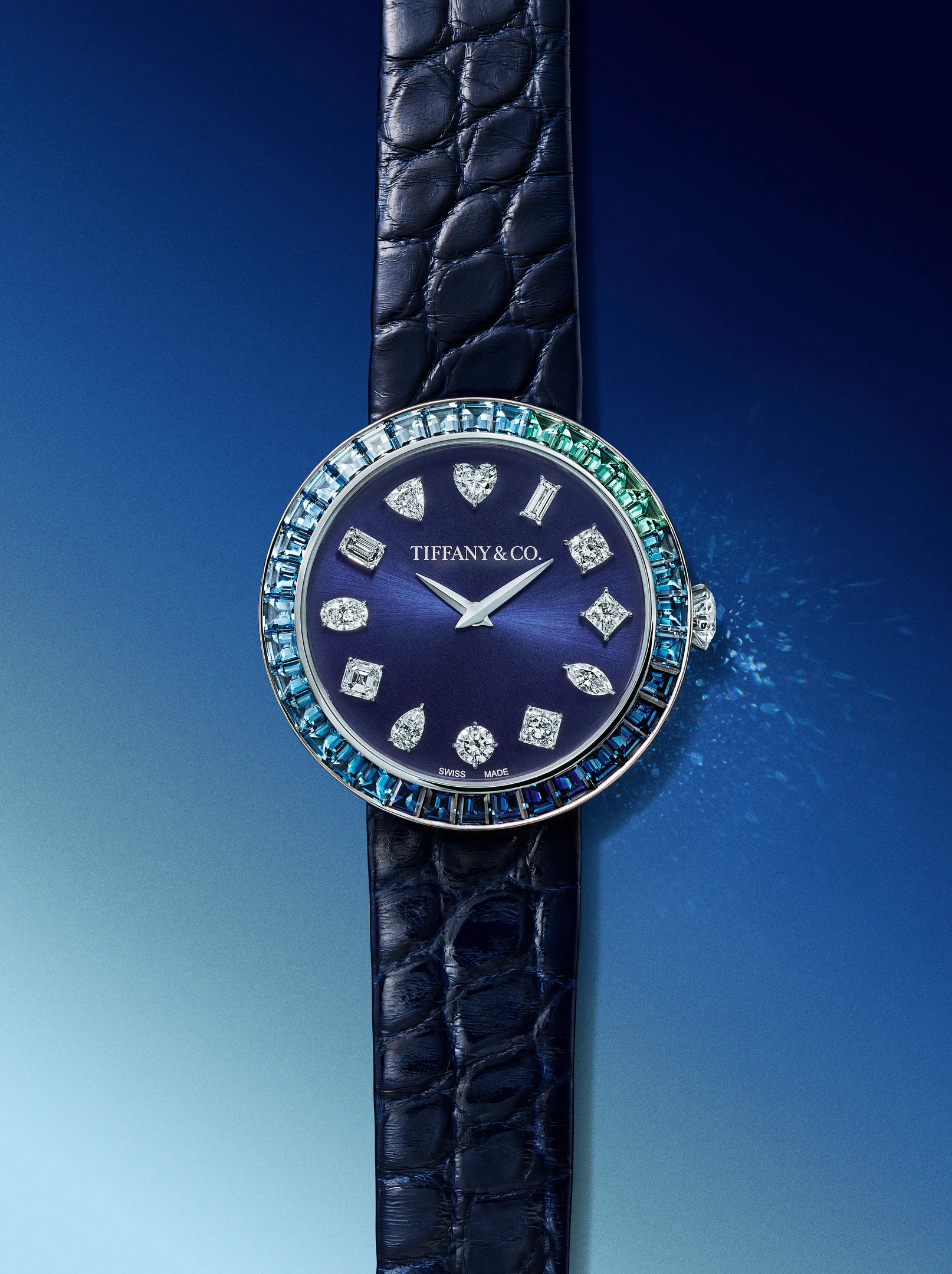 Mit der Eternity Baguette reduziert Tiffany & Co. Uhrmacherei auf das Wesentliche und erhebt das Setzen von Edelsteinen zur zentralen Erzählung. Ihre Geschichte beginnt nicht auf dem Zifferblatt, sondern im Kreis. Die Lünette ist als ununterbrochene Linie aus Baguette-Steinen gestaltet - eine bewusste Referenz an den Eternity-Ring, jenes Schmuckstück, das seit Generationen für Unendlichkeit steht. Der gestalterische Reiz liegt im Detail. Zwölf Stunden, zwölf unterschiedliche Schliffe - vom klassischen Brillanten bis zum Herz, das bei zwölf Uhr sitzt wie ein leiser emotionaler Anker. Es ist ein poetischer Moment in einer Uhr, die ansonsten kompromisslos präzise wirkt. Besonders das Modell Blue Gradient zeigt, wie souverän Tiffany mit Farbe umgeht. Saphire, Topase und Smaragde verschmelzen zu einem tiefen Blau, das sich je nach Licht verändert. Unter der funkelnden Oberfläche schlägt erstmals ein automatisches Werk in einer regulären Eternity. Ein leiser Hinweis an Kenner: Diese Uhr ist mehr als ein Juwel. Sie ist gemacht, um getragen zu werden - jeden Tag, nicht nur zu besonderen Anlässen.