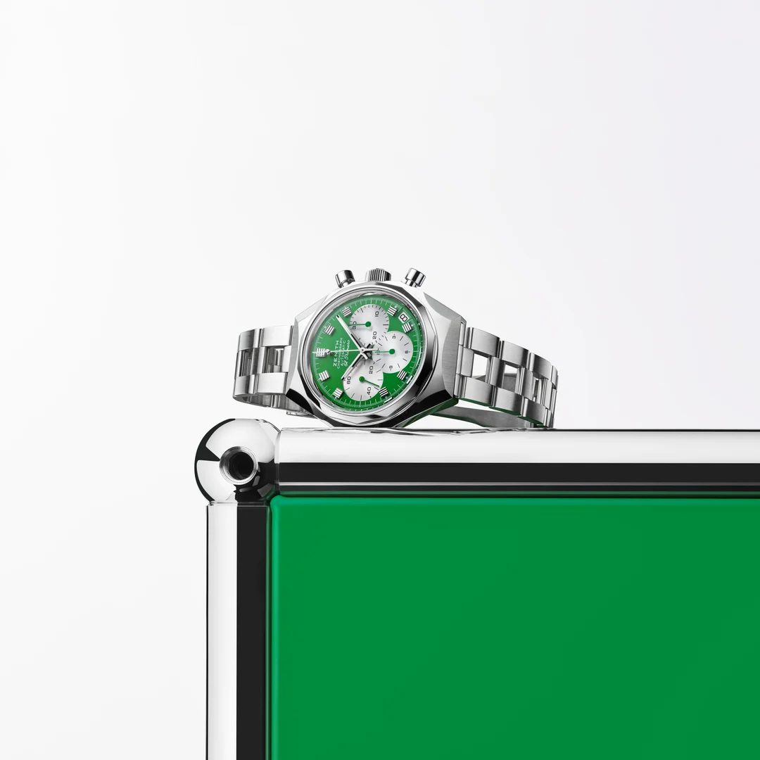 Die Zifferblätter greifen die Farbpalette des USM Haller Systems auf: Grün, Orange, Gelb und Blau. Quadratische Stundenindizes mit horizontalen Rillen akzentuieren die architektonische Präzision, während die Chronographenzähler in Silber das Zifferblatt räumlich gliedern. Eine kleine Kugel am Chronographenzeiger, inspiriert von den USM-Verbindungen, verweist auf die Spielbarkeit der Struktur, und der versteckte Zenith-Stern fungiert als subtiler Hinweis auf die erzählerische Ebene der Uhrmacherkunst.