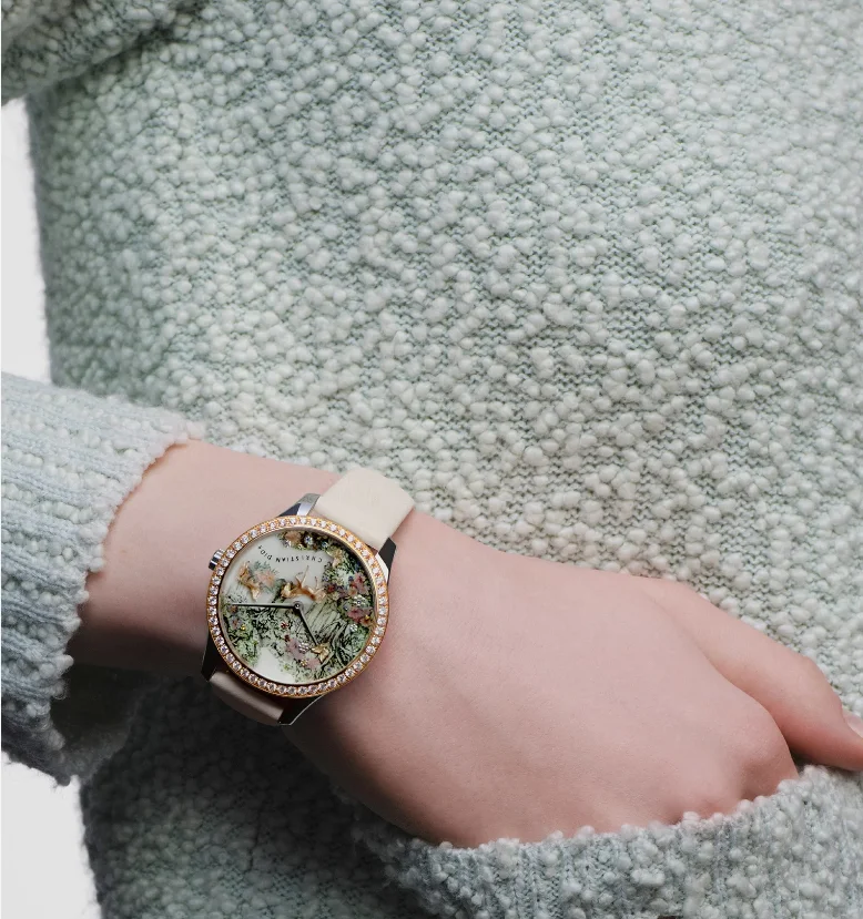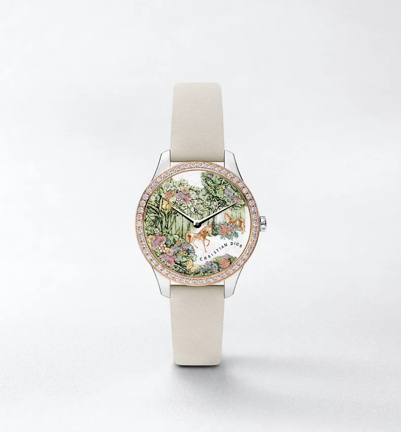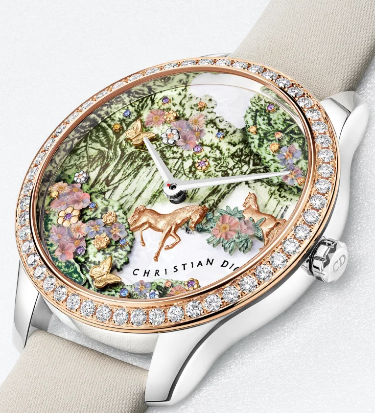 Dior nimmt einen anderen Ansatz. Auf dem Zifferblatt wandert das Pferd durch einen Zauberwald aus Perlmutt, Gold und farbenfrohen Steinen - wie aus einem modernen Märchenbuch. Die Roségold-Lünette, akzentuiert von 52 Brillanten, kontrastiert mit dem Edelstahlgehäuse von 36 Millimetern. Jeder Stein, jede Linie erzählt von einem raffinierten Sinn für Komposition. Die Uhr ist nicht nur Schmuck, sie ist narrative Landschaft, ein poetisches Fragment, das die Träume des Trägers einfängt.