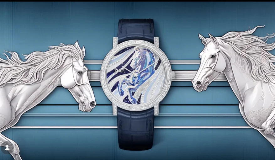 Bei Piaget zeigt die „Altiplano Zodiac Horse“ ein springendes Pferd, meisterhaft umgesetzt in Handgravur und mehrschichtigen Emaille-Techniken, die von der renommierten Anita Porchet geleitet werden. Weißgold, flach, mit funkelnden Diamanten besetzt, limitiert auf 18 Stück - die Uhr ist ein Kunstwerk, das Zeit und Handwerkskunst verschränkt. Hier wird die Bewegung eingefroren, die Energie konserviert, und doch bleibt der Eindruck von Dynamik.