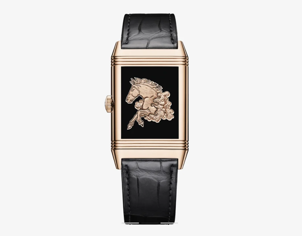 Eine besonders raffinierte Hommage liefert Jaeger-LeCoultre mit der Reverso Tribute Enamel „Horse“. Auf dem Wendegehäuse erhebt sich ein handgraviertes Pferd aus einem Kranz goldener Wolken, flankiert von glänzend schwarzer Grand-Feu-Emaille. Die polierte Oberfläche kontrastiert mit sandgestrahlten Wolken, die Mähne ist mit schwarzem Rhodium fein gezeichnet. Licht bricht sich in Details, die Bewegung wird sichtbar, als hätte der Zeitmesser selbst Atem.