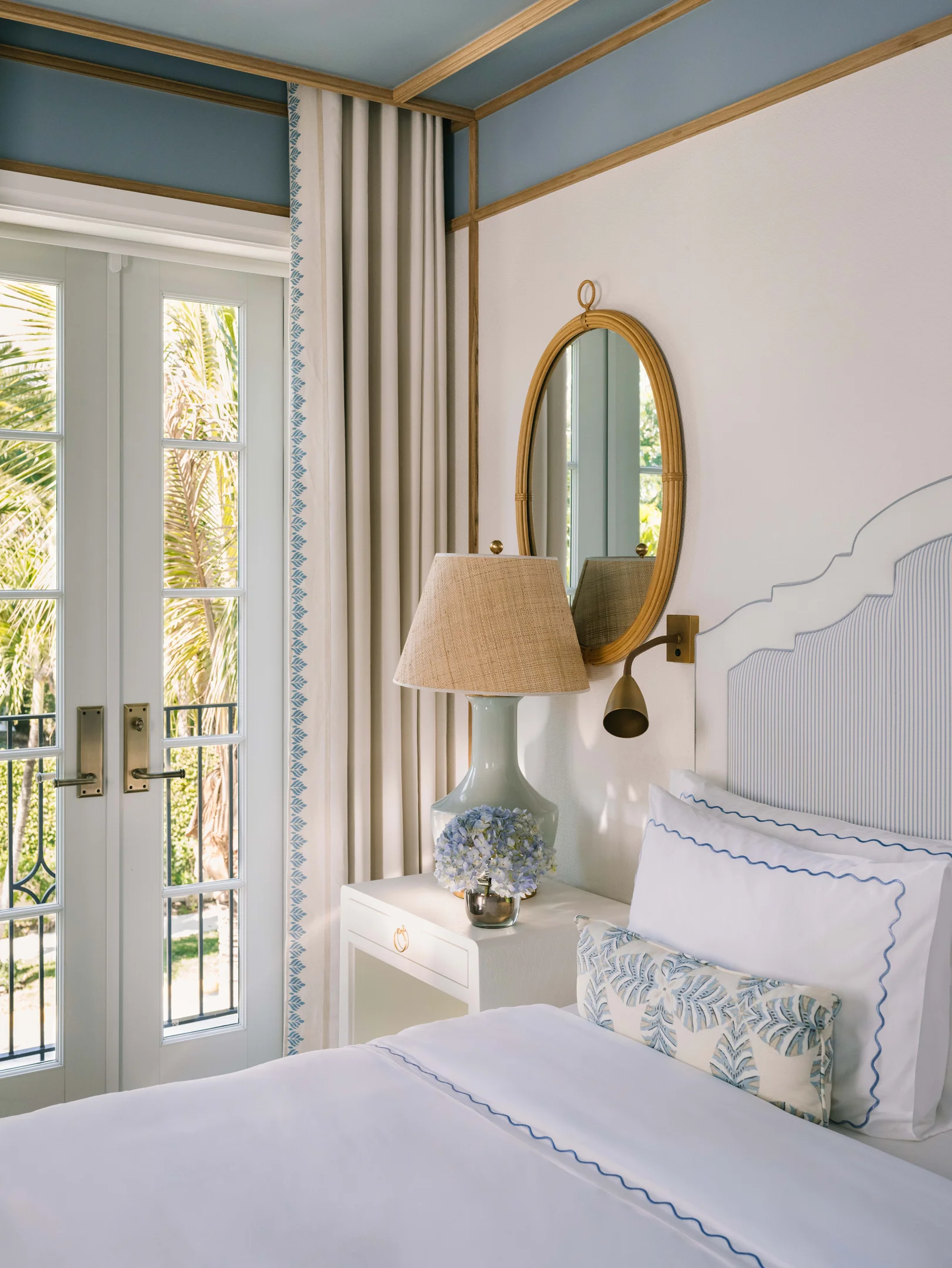 Schon die Fassade zeigt, worum es hier geht. Mediterrane Revival-Architektur prägt das Haus seit fast einem Jahrhundert und bleibt auch jetzt bestimmend. Im Inneren wird dieses Erbe nicht kopiert, sondern weitergeführt. Tino Zervudachi arbeitet mit Weiß- und Blautönen, feinen Stoffen und warmen Materialien. Palmenmotive, Federn und kleine Verweise auf Sternbilder ergänzen die Räume, ohne sie zu dominieren. Alles wirkt durchdacht und gleichzeitig leicht. Mit 41 Zimmern und Suiten bleibt das Haus bewusst überschaubar. Es richtet sich an Gäste, die keine große Bühne suchen. Die Räume sind ruhig angelegt und wirken ausgewogen, ohne kühl zu werden.