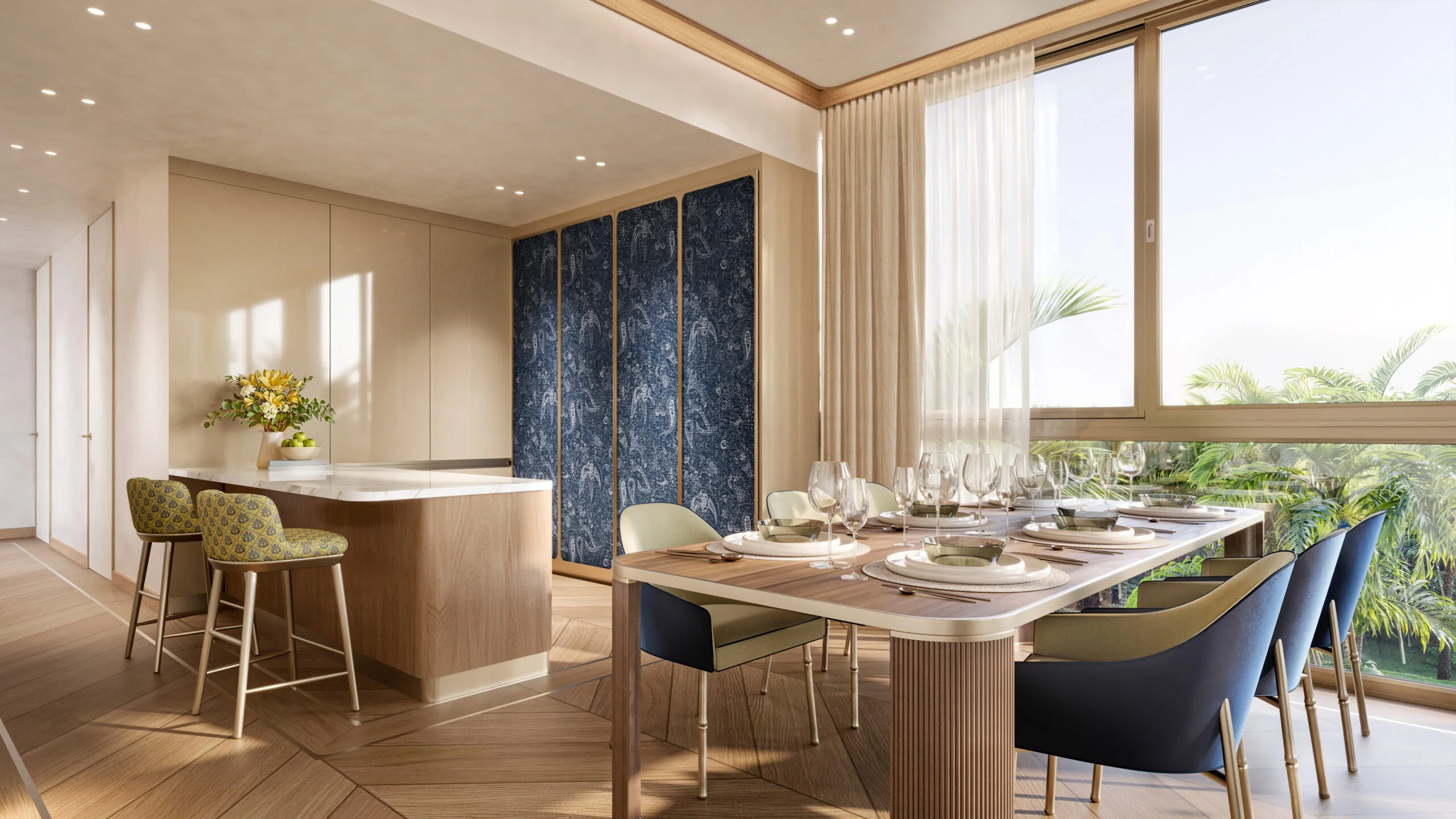 Die Farbpalette orientiert sich an der Landschaft der Andamanensee: tiefe Blau- und Grüntöne, ergänzt durch helle, sonnengebleichte Nuancen. Samtstoffe, handwerklich bearbeitetes Holz und polierter Marmor bilden ein Interieur, das zugleich opulent und ruhig wirkt. Man erkennt darin den Versuch, italienische Wohnkultur mit tropischer Leichtigkeit zu verschränken. Besonders deutlich wird das in den großen Glasflächen, die Innen- und Außenraum beinahe auflösen. Die Architektur rahmt die Landschaft, statt sie zu dominieren.